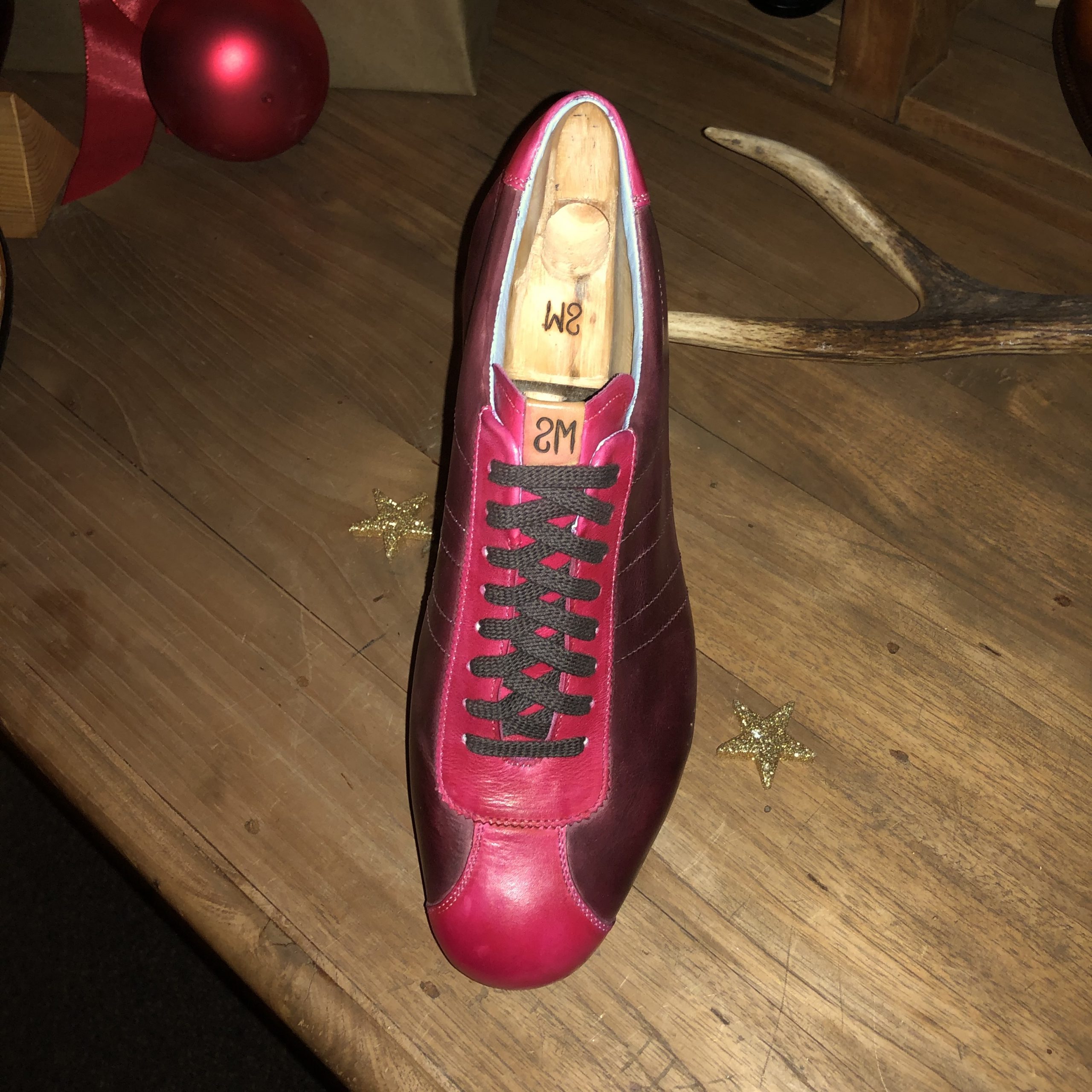 Aus feinstem handgefärbten Kalbsleder (Crust) von Hand gemacht. Futter und Decksohlen komplett aus Leder.